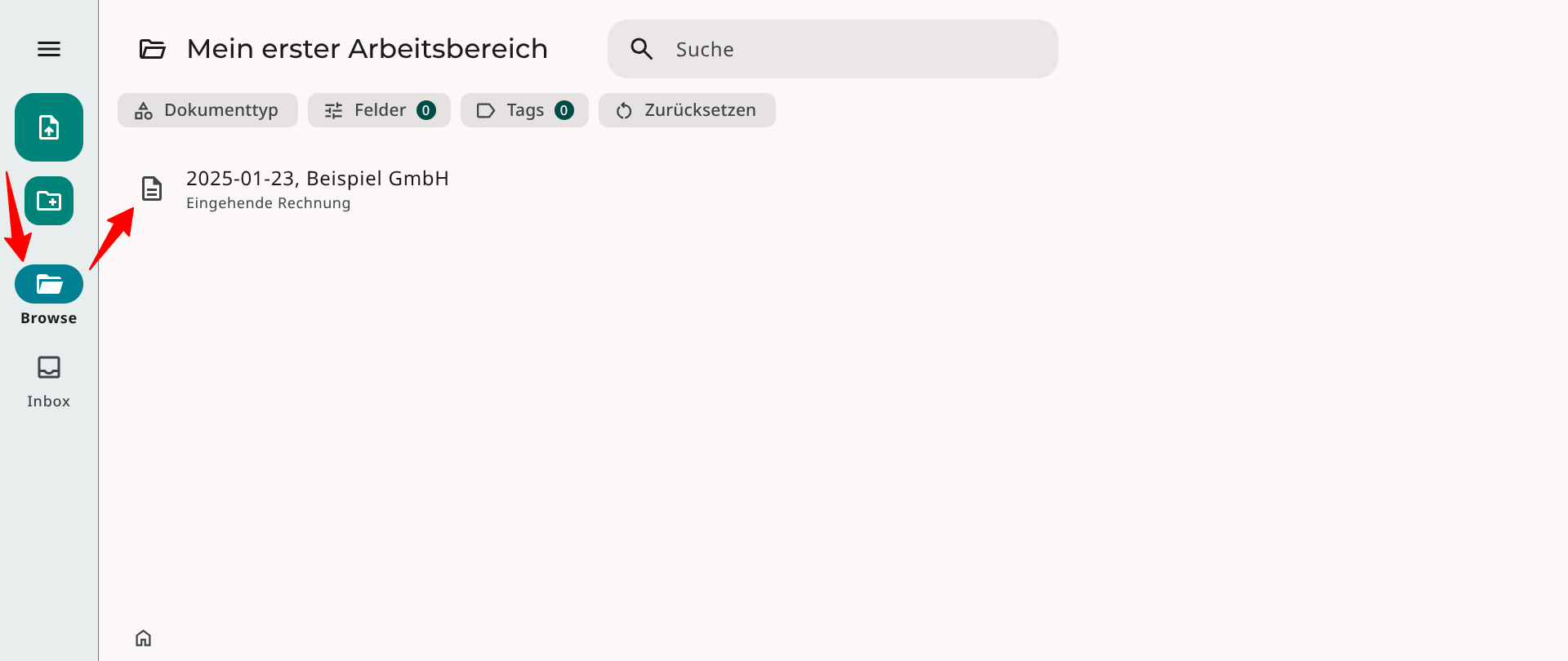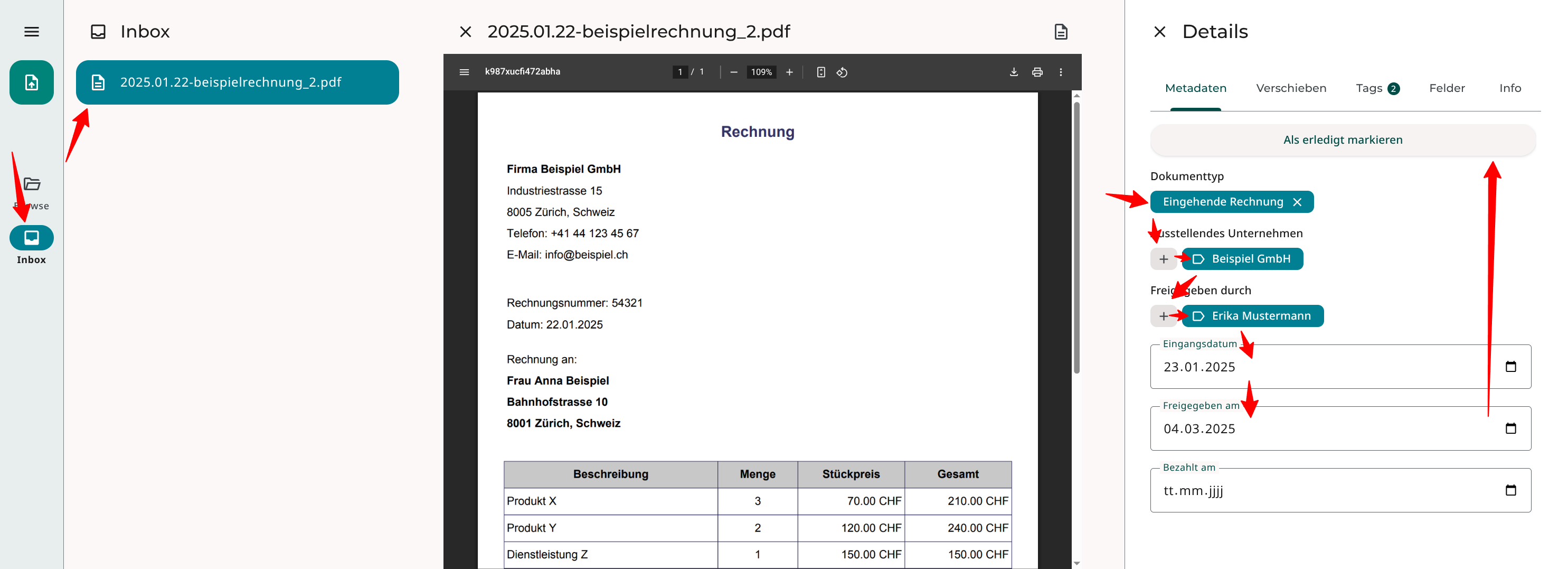 With a click on «Mark as done», the document is removed from the inbox and can from now on be found via the «Browse» view.