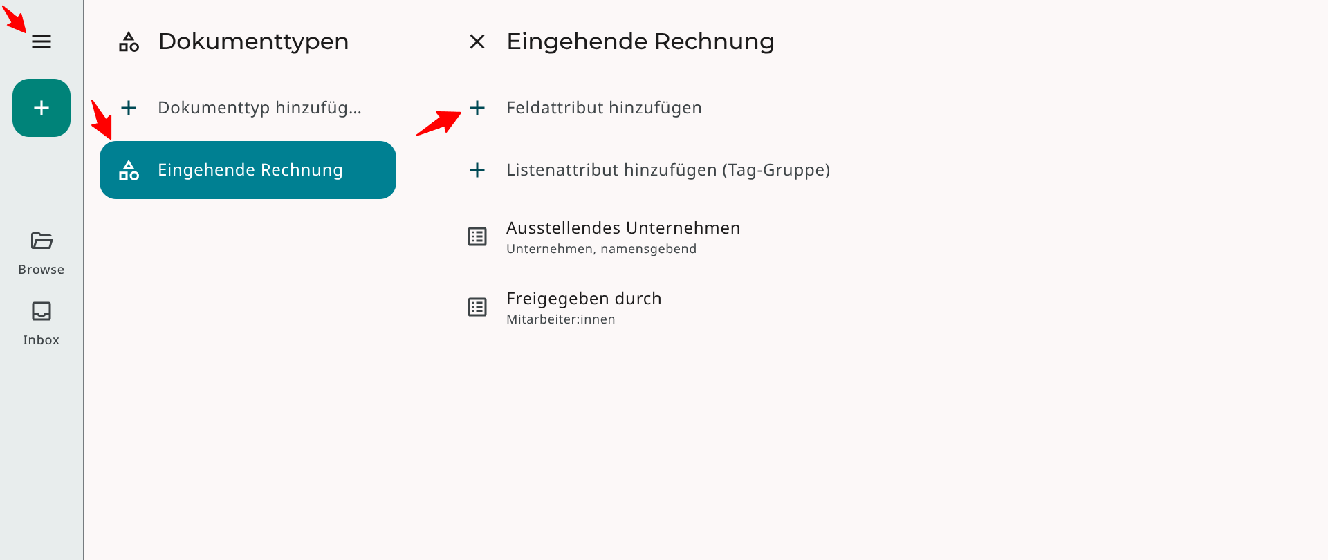 Afterwards, it is possible to add the tag groups as list attributes in the document type management («Document types» in the main menu).